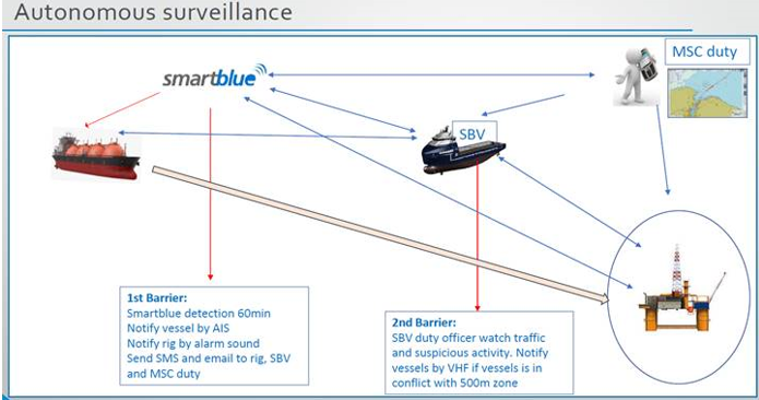 Historically on the Norwegian Continental Shelf various types of surveillance have been used. The most common one is Equinor marine/Operation that handles surveillance for most operators. The surveillance equipment/system used by Equinor is Vissim. During 2013, Equinor did not have spare capacity for smaller operators and other solutions had to be used. The latest of these new solution is the autonomous Smartblue system from Well Expertise. The system is developed together with Raytheon Anschutz to meet the requirements on the NCS.